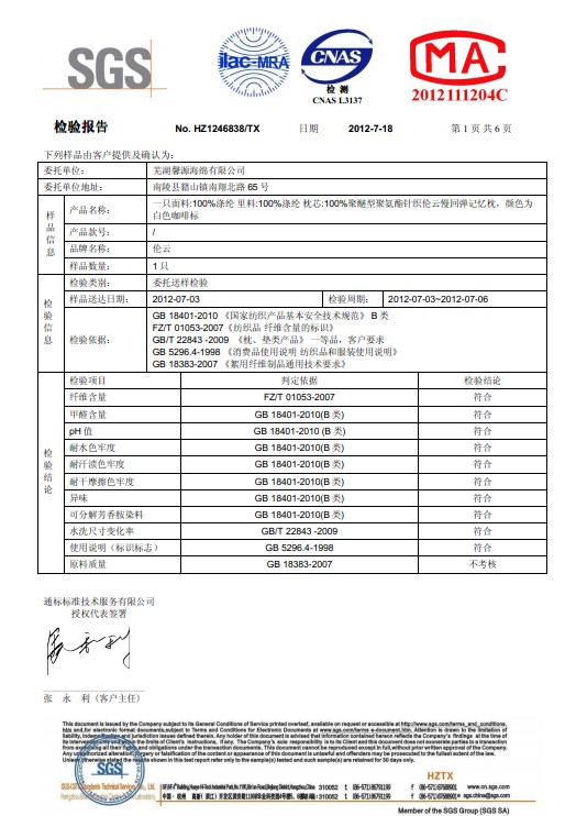 热烈祝贺我司慢回弹记忆枕通过SGS产品检测